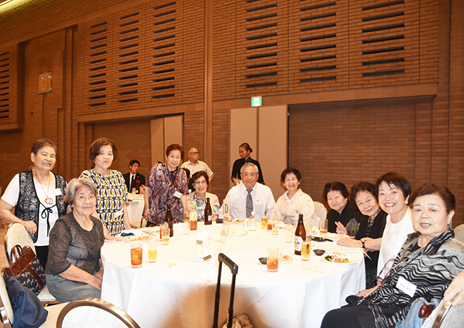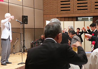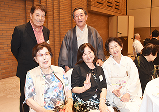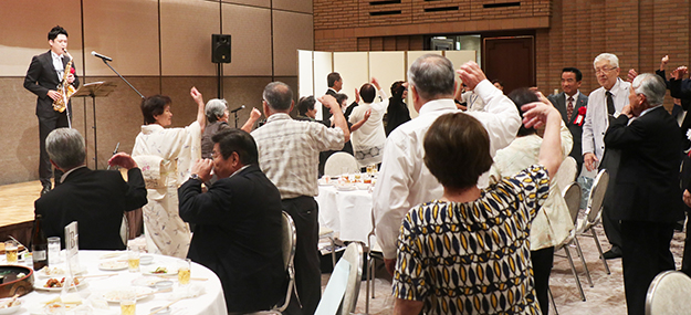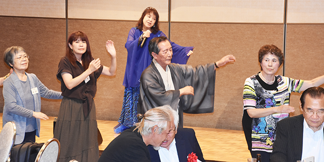 続いて山ゆり会メンバーの折原誠司さんと、奄美民謡大会壮年の部で最優秀賞を受賞した脇田さんが祝い唄の「朝花節」を歌い祝福した後、和田純男顧問の音頭で乾杯。参加者は久しぶりの再会を喜び合い、会場には歓談の輪が広がった。