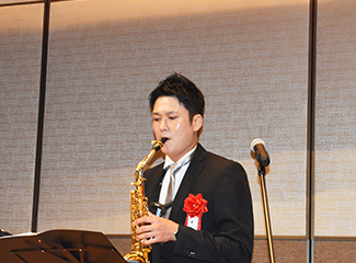 サックスホーンを演奏する峰村さん |