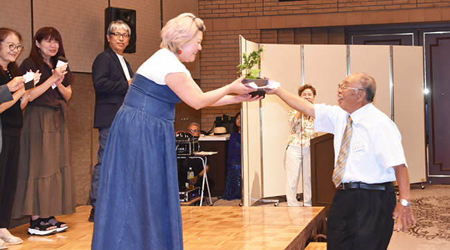 後段余興では、脇田さんら2人によるシマ唄の後にリフレッシュタイムとしてお楽しみ抽選会が行われた。各テーブルごとの当たりくじ勝者10人が舞台に上がり、記原顧問が日本皐月協会に新花登録したサツキ「島育ち」や黒糖焼酎「里の曙」、それに叶顧問提供のワインがプレゼントされた。