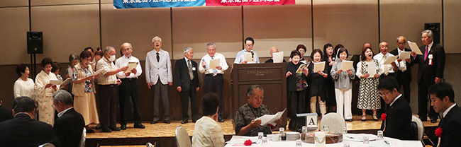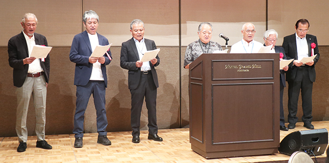 懇親会前段の部は、仁禮事務局長と牧園孝一副幹事長の司会で進行。郷土遥拝と物故者黙とうに続き、今回は奄美高校と旧大島工業、旧大島実業の校歌を卒業生が斉唱した。会場に旧大島工業の校歌が流れたのは初だった(聴く)。
