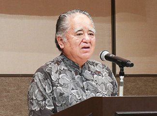 来賓紹介後、来賓を代表して奄美から出席した母校の脇浩一校長と配田ヶ丘会同窓会本部の和田孝之会長の2人がそれぞれ祝辞を述べた。