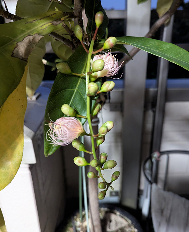 亜熱帯地域に育つサガリバナは奄美大島が北限と言われています。Yさんは、サガリバナを育てている奄美在住のSさんに「実生の苗から咲かせるには10年ほどかかる。咲いた実績のある枝を挿し木で育てた苗が早く咲く」と、言われたそうです。そんなことから5年目で咲いたことに自分自身がびっくりしています。