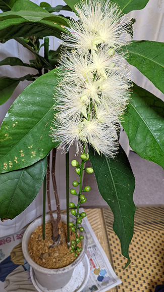 埼玉県春日部市の拙宅で7月13日夜、サガリバナが咲きました。実生から5年目の幼木で樹高105センチ、根元の直径2センチの小さな木です。