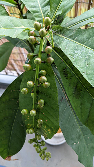サガリバナの花言葉は「幸福が訪れる」、または「幸運が訪れる」と言われているそうです。管理人宅ではサガリバナをもう1本育てています。新芽の若葉の色からこの木は岡山さん宅と同じ白系の花のような気がしており、来年夏は咲くのではないかと期待しています。