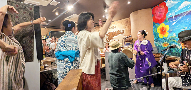 奄美出身者以外も出身者の踊りを見よう見まねで、夢中で合わせ踊り出しました。最初は「ちょっと恥ずかしい…」と戸惑っていた東京の友人も、周りの楽しそうな雰囲気に引っ張られ、いつの間にか踊りの輪に入り満面の笑みで腕を振り、すっかり六調の渦に巻き込まれていました。
