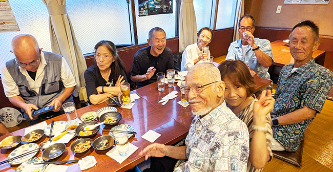 奄美出身のY君は、目を開いて満面の笑みを浮かべながら故郷を懐かしむように聴き入っています。曲の合間のトークも、また栄さんの魅力の一つ。歌の背景にある島の物語や、ご自身の体験談をユーモラスに語ってくれるので、私たちはさらにシマ唄の世界に引き込まれていきました。