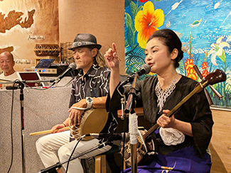 | シマ唄を熱唱する栄百々代さん(お囃子はタナカアツシさん) |