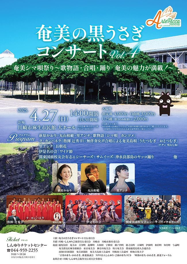 コンサートは川崎・しんゆり芸術祭実行委員会や川崎市、同市教育委員会との共催で、奄美市や龍郷町など奄美群島の12市町村、奄美群島広域事務組合、東京・神奈川・埼玉奄美会、鹿児島県、関東鹿児島県人連合会などが後援しています。